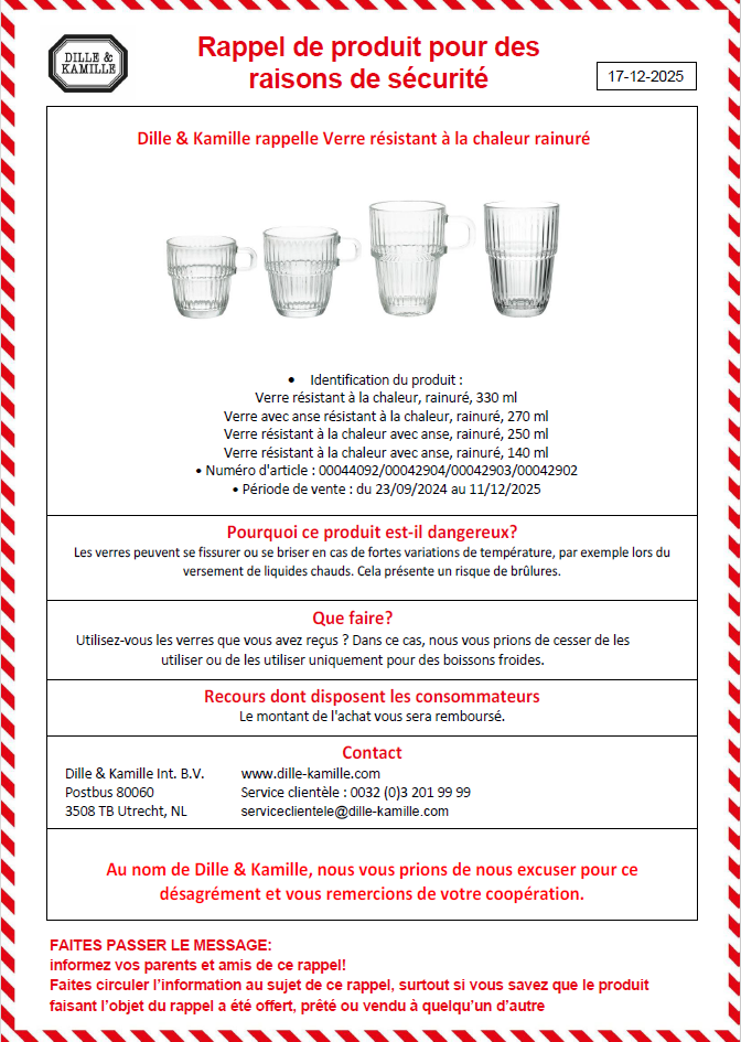 Retour à toutes les questions Dille & Kamille rappelle Verre résistant à la chaleur rainuré Retour à toutes les questions